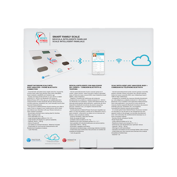 Registre y Visualice las mediciones de la báscula directamente en su teléfono o tableta (Android 5.0 con Bluetooth 4.0) instalando nuestra APP Médico Fitness.